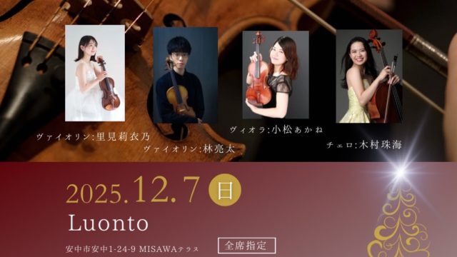 *クリスマスコンサート~カルテットで奏でる素敵なクリスマス~・Luonto 群馬県安中市・2025年12月7日(日) 17時30分開場 18時00分ディナー 18時30分開演・大人6000円(ワンプレートディナー・ワンドリンク付き)・演奏 ...
